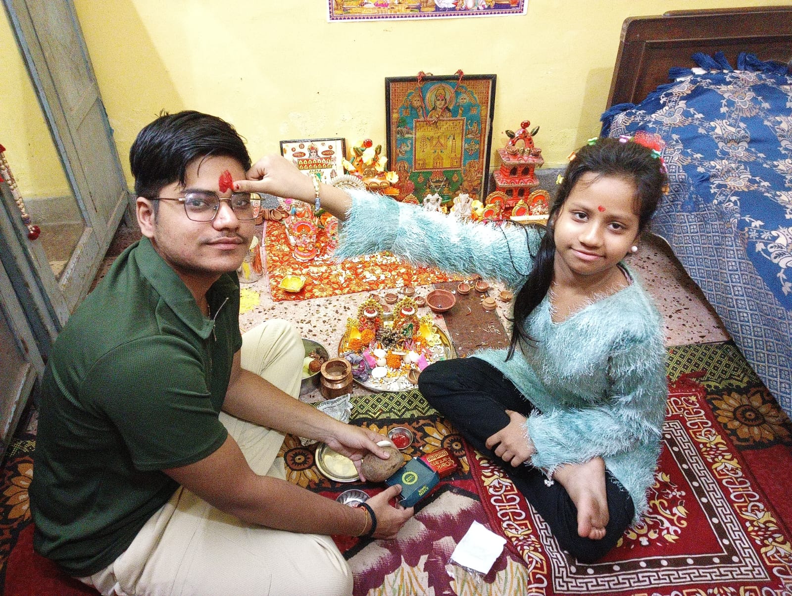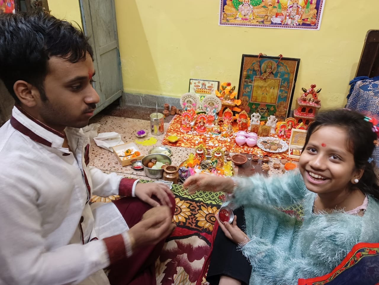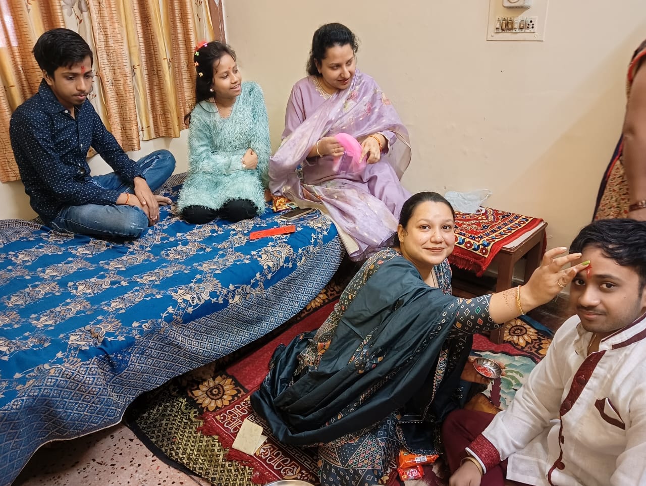 भाई दूज पर बहनों ने अपने भाई के तिलक किया और लंबी आयु की कामना की । भाइयों ने बहनों को गिफ्ट दिया।