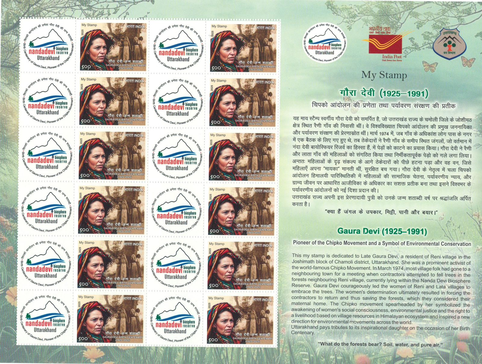 चमोली : शनिवार को डाक विभाग उत्तराखंड द्वारा रैणी गाँव, जोशीमठ, चमोली में चिपको आंदोलन की प्रणेता तथा पर्यावरण संरक्षण की प्रतीक स्वर्गीय गौरा देवी की जन्म शताब्दी के अवसर पर एक विशेषीकृत माई स्टाम्प (कस्टमाइज्ड माई स्टाम्प) तथा विशेष आवरण जारी किया गया।
