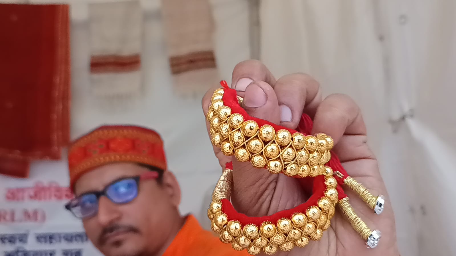 हरिद्वार में आयोजित देवभूमि रजत उत्सव में लगाए गए स्टॉल में टिहरी के कीर्ति नगर ब्लॉक से पहुंचे घड़ियाल देवता स्वयं सहायता समूह की ओर से उत्तराखंड की संस्कृति से जुड़े पारंपरिक परिधान को लेकर कार्य कर रहा है।