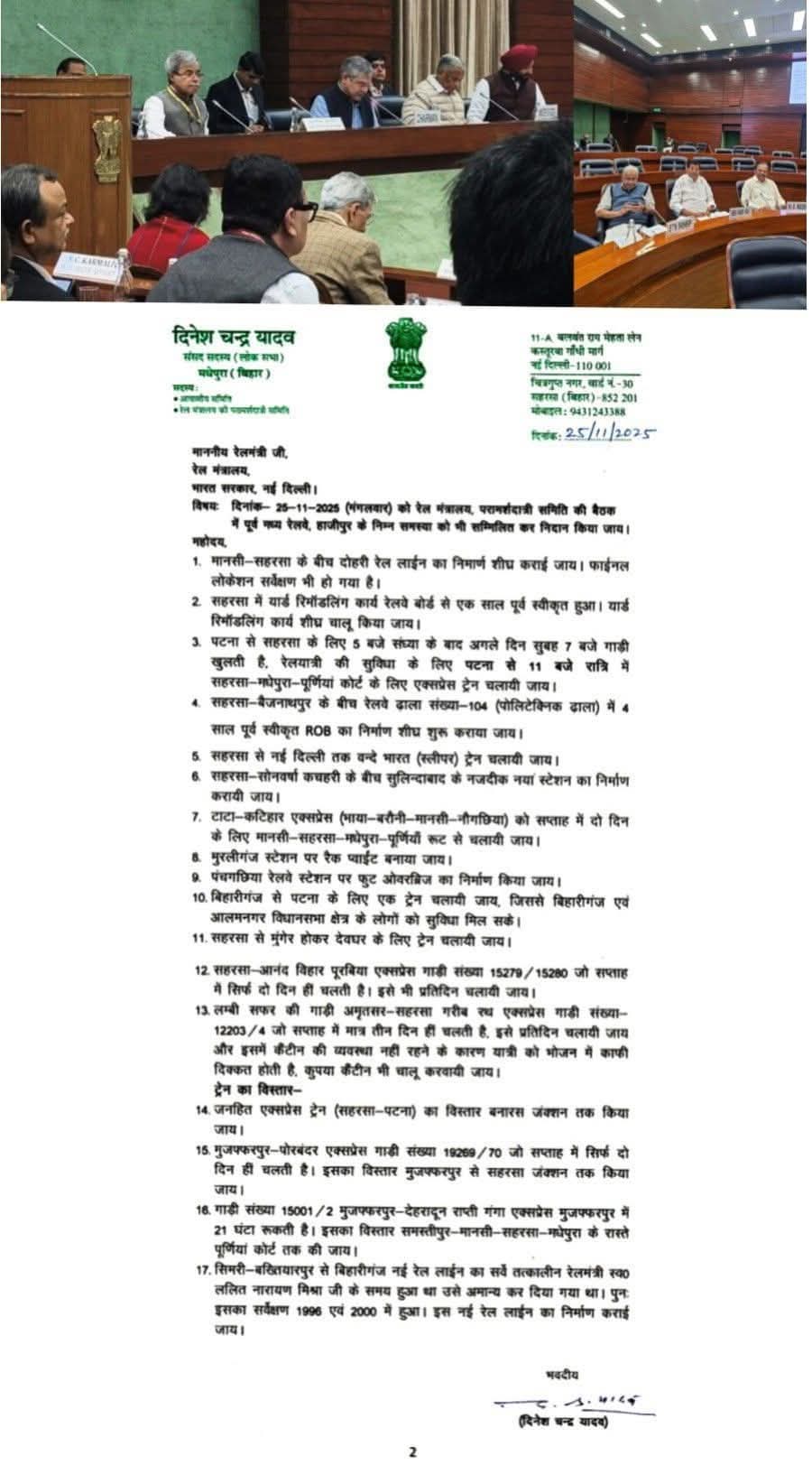 हरिद्वार। मधेपुरा(बिहार )के सांसद आदरणीय दिनेश चन्द्र यादव ने 25 नवंबर 2025 को बुलाई गई रेल परामर्शदात्री समिति की बैठक में पूर्व मध्य रेल, हाजीपुर से संबंधित विभिन्न समस्याओं के त्वरित समाधान की मांग रखी।