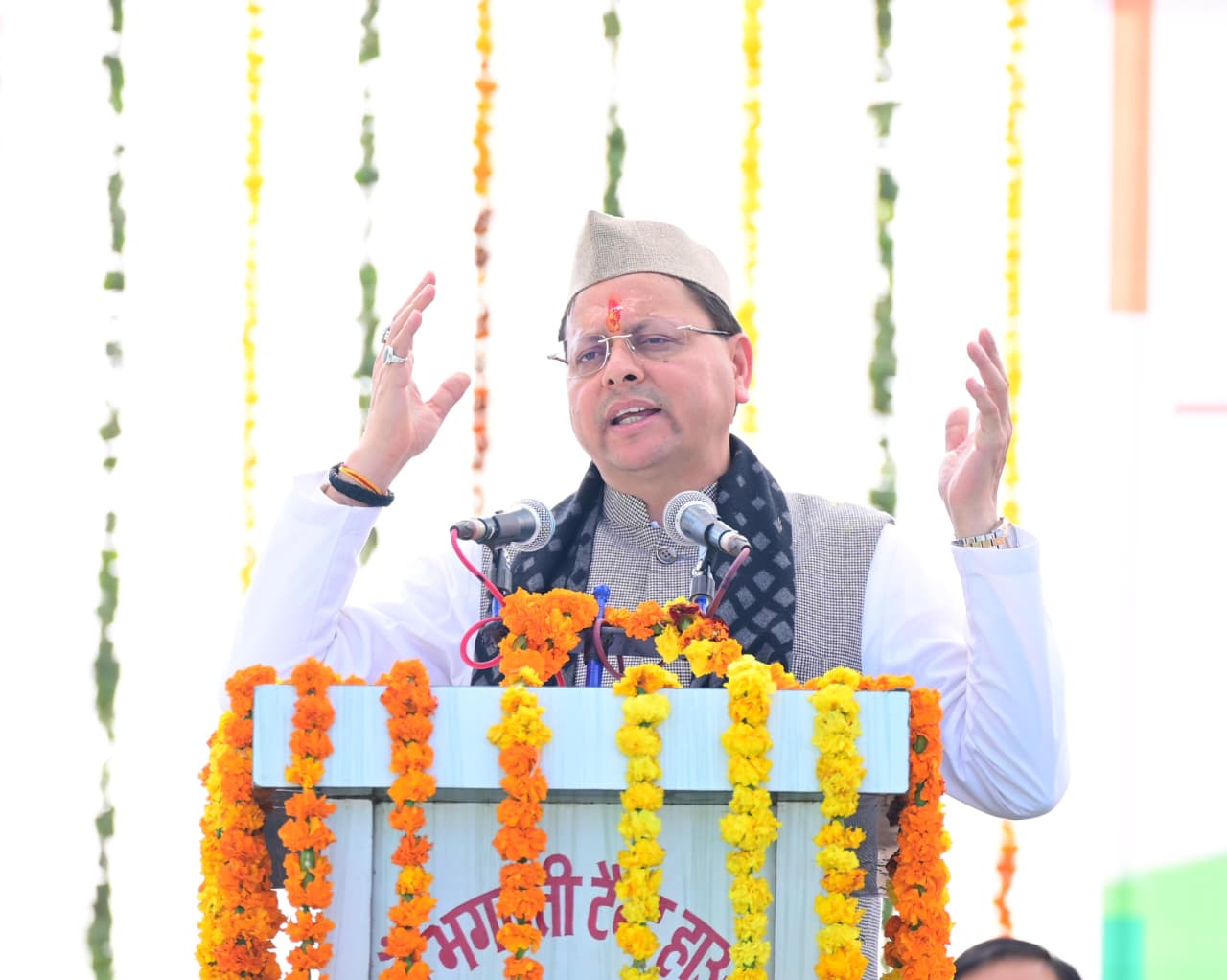 मुख्यमंत्री श्री पुष्कर सिंह धामी ने आज अपने बागेश्वर दौरे के दूसरे दिन, केदारेश्वर मैदान, कपकोट में आयोजित जन सम्मेलन में प्रतिभाग किया, जहाँ उनका माल्यार्पण कर स्वागत किया गया तथा कार्यक्रम में उपस्थित जनसमूह ने उत्साहपूर्वक मुख्यमंत्री का अभिवादन किया।