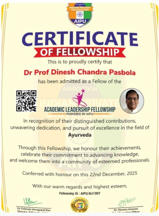 देहरादून। एसोसिएशन ऑफ इंडियन प्राइवेट यूनिवर्सिटीज (AIPU), गाजियाबाद , उत्तर प्रदेश, भारत द्वारा आयुर्वेद विभाग, उत्तराखंड के दो वरिष्ठ, काबिल एवं अनुभवी आयुर्वेद चिकित्सा अधिकारियों डॉ० प्रो० डी० सी० पसबोला और डॉ० अजय चमोला को “फेलोशिप इन आयुर्वेद (FAIPU)” उपाधि सम्मान प्रदान किया गया है। जिसके डाइरेक्टर, फेलोशिप अफेयर्स – डॉ० सी० वेणुगोपाल राव एवं चीफ एक्जीक्यूटिव आफिसर – डॉ० नवीन अमन्ना हैं