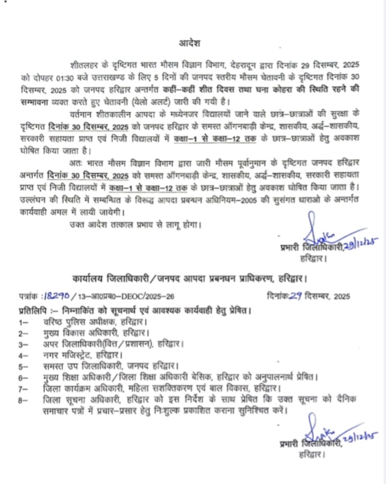 शीतलहर के दृष्टिगत नर्सरी से कक्षा 12 टक तक समस्त विद्यालय कल बंद रहेंगे