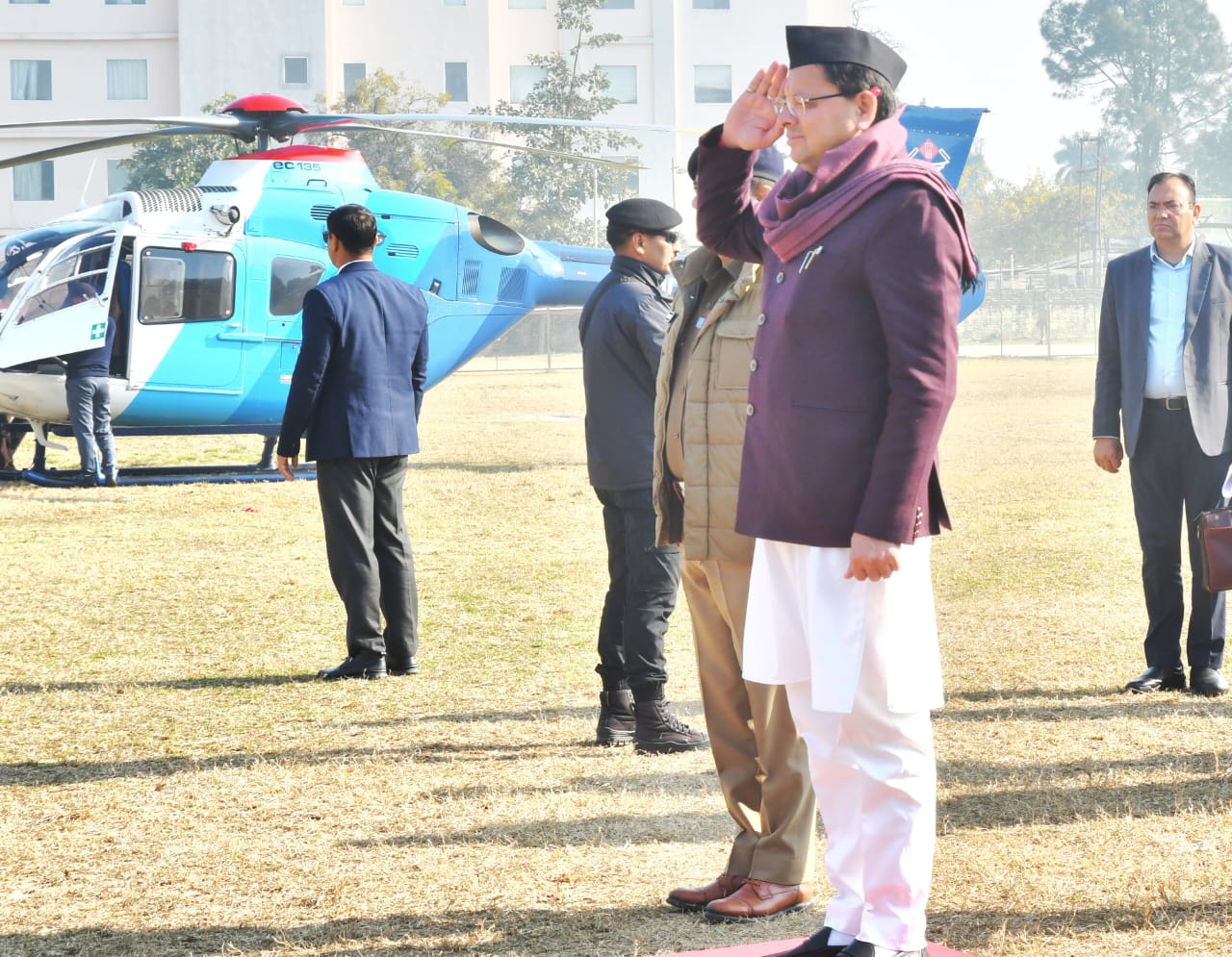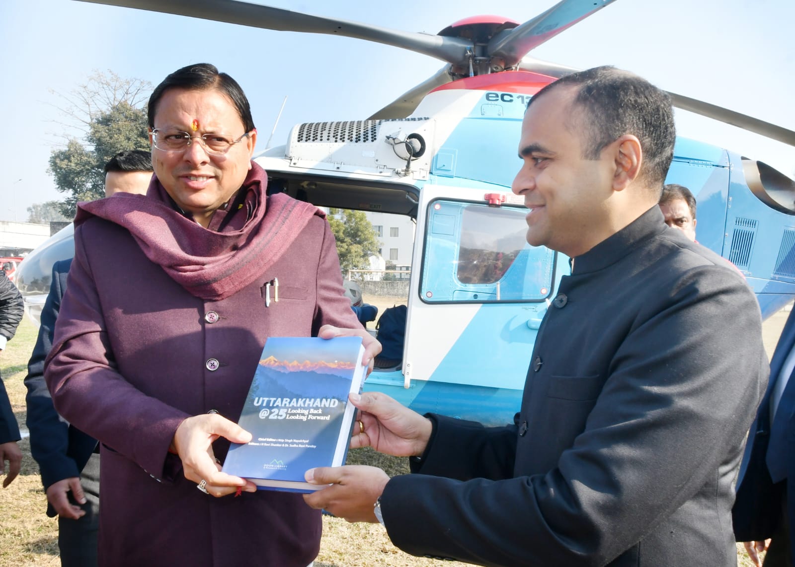 जनपद आगमन पर जिलाधिकारी मयूर दीक्षित ने हेलीपैड पर मुख्यमंत्री को पुस्तक भेट कर स्वागत किया,इस अवसर पर वरिष्ठ पुलिस अधीक्षक प्रमेंद्र सिंह डोभाल सहित जनप्रतिनिधि, प्रशासनिक एवं पुलिस अधिकारी मौजूद रहे।