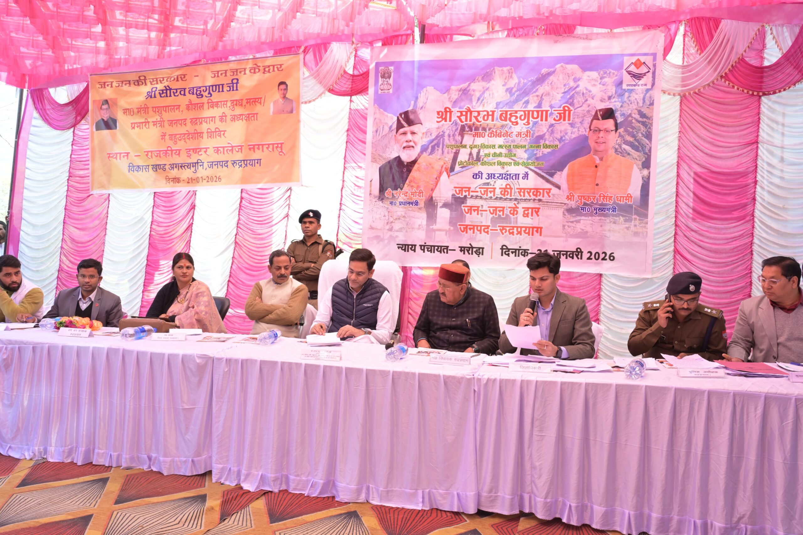 इसी क्रम में आज दिनांक 21 जनवरी 2026 को मा० मंत्री (प्रभारी मंत्री, जनपद रुद्रप्रयाग) पशुपालन, दुग्ध विकास, मत्स्य पालन, गन्ना विकास एवं चीनी उद्योग, प्रोटोकॉल, कौशल विकास एवं सेवायोजन विभाग, उत्तराखण्ड सरकार सौरभ बहुगुणा की अध्यक्षता में न्याय पंचायत मरोड़ा अंतर्गत राजकीय इंटर कॉलेज नगरासू (रुद्रप्रयाग) में बहुउद्देशीय शिविर का आयोजन किया गया।
