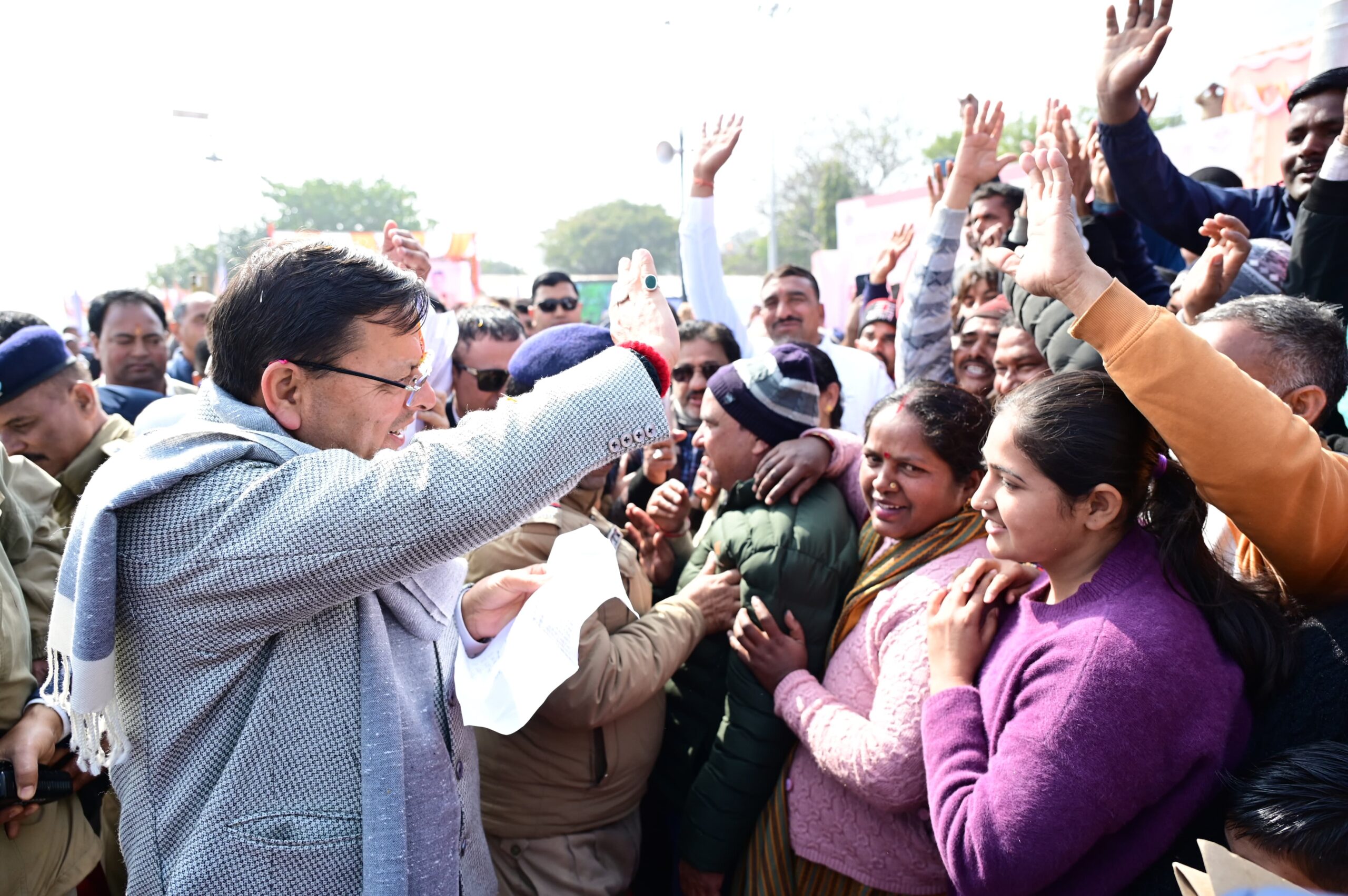 कार्यक्रम के दौरान उन्होंने स्थानीय महिलाओं के साथ कुमाऊँ की प्राचीन लोक परंपरा “खड़ी होली” में भी उत्साहपूर्वक भाग लिया। महिलाओं ने पारंपरिक वेशभूषा में घेरा बनाकर खड़े होकर कुमाऊँनी लोकगीत गाए, जिनमें मुख्यमंत्री ने भी स्वर मिलाया।