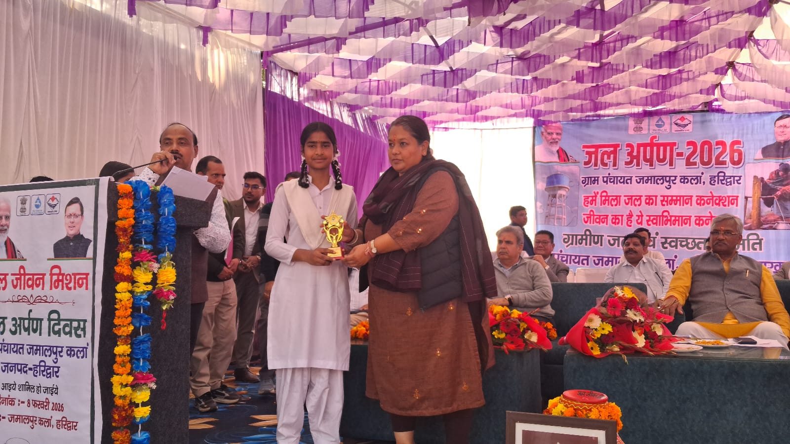 जल जीवन मिशन के अंतर्गत आयोजित जल अर्पण दिवस कार्यक्रम के दौरान जनपद स्तर पर आयोजित विभिन्न खेल प्रतियोगिताओं, पेंटिंग एवं कलाकृतियों में उत्कृष्ट प्रदर्शन करने वाली प्राथमिक विद्यालय जमालपुर कलां की छात्राओं को सम्मानित किया गया।