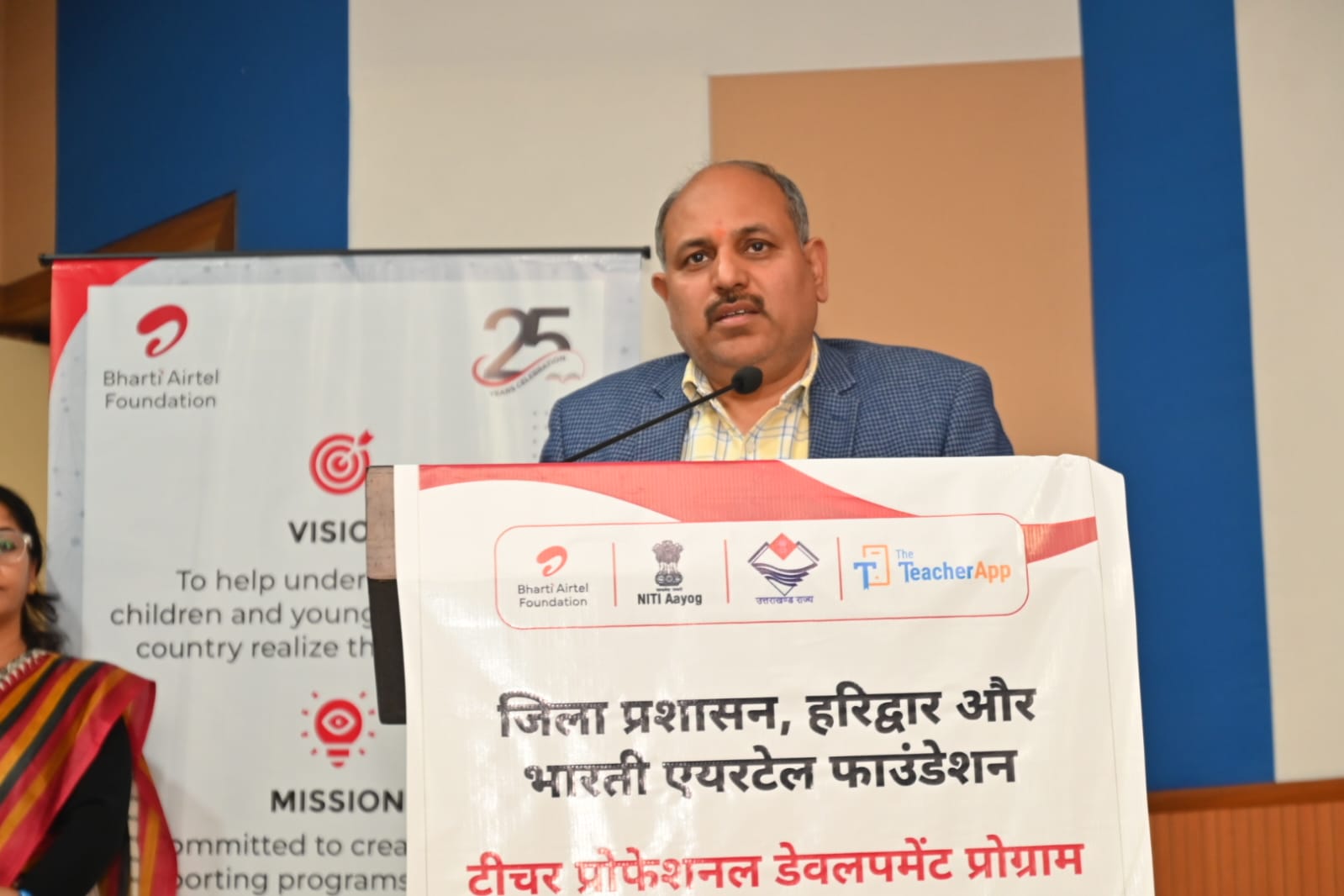 हरिद्वार।हरिद्वार जनपद के राजकीय विद्यालयों के शिक्षकों के प्रोफेशनल डेवलपमेंट तथा प्रभावी शिक्षण पद्धतियों को सशक्त बनाने के उद्देश्य से भारती एयरटेल फाउण्डेशन, नीति आयोग एवं जिला प्रशासन हरिद्वार द्वारा संयुक्त रूप से ऑनलाइन शिक्षक प्रोफेशनल डेवलपमेंट प्रोग्राम का शुभारंभ आज विकास भवन रोशनाबाद सभागार में आयोजित किया गया। यह शिक्षक विकास कार्यक्रम ’द टीचर एप्प’ के माध्यम से समावेशी और प्रभावी शिक्षण वातावरण के निर्माण हेतु राष्ट्रीय शिक्षा नीति 2020 की अवधारणा के अनुरूप आवश्यक कौशलों, आधुनिक शिक्षण तकनीकों और विविध पद्धतियों के माध्यम से शिक्षकों की क्षमताओं को बेहतर बनाने के लिए तैयार किया गया है। कार्यक्रम में बुनियादी साक्षरता एवं संख्याज्ञान (एफ.एल.एन), डिजिटल शिक्षण, कक्षा प्रबंधन और नवीन शैक्षणिक विधाओं जैसे महत्वपूर्ण विषयों को शामिल किया गया है।