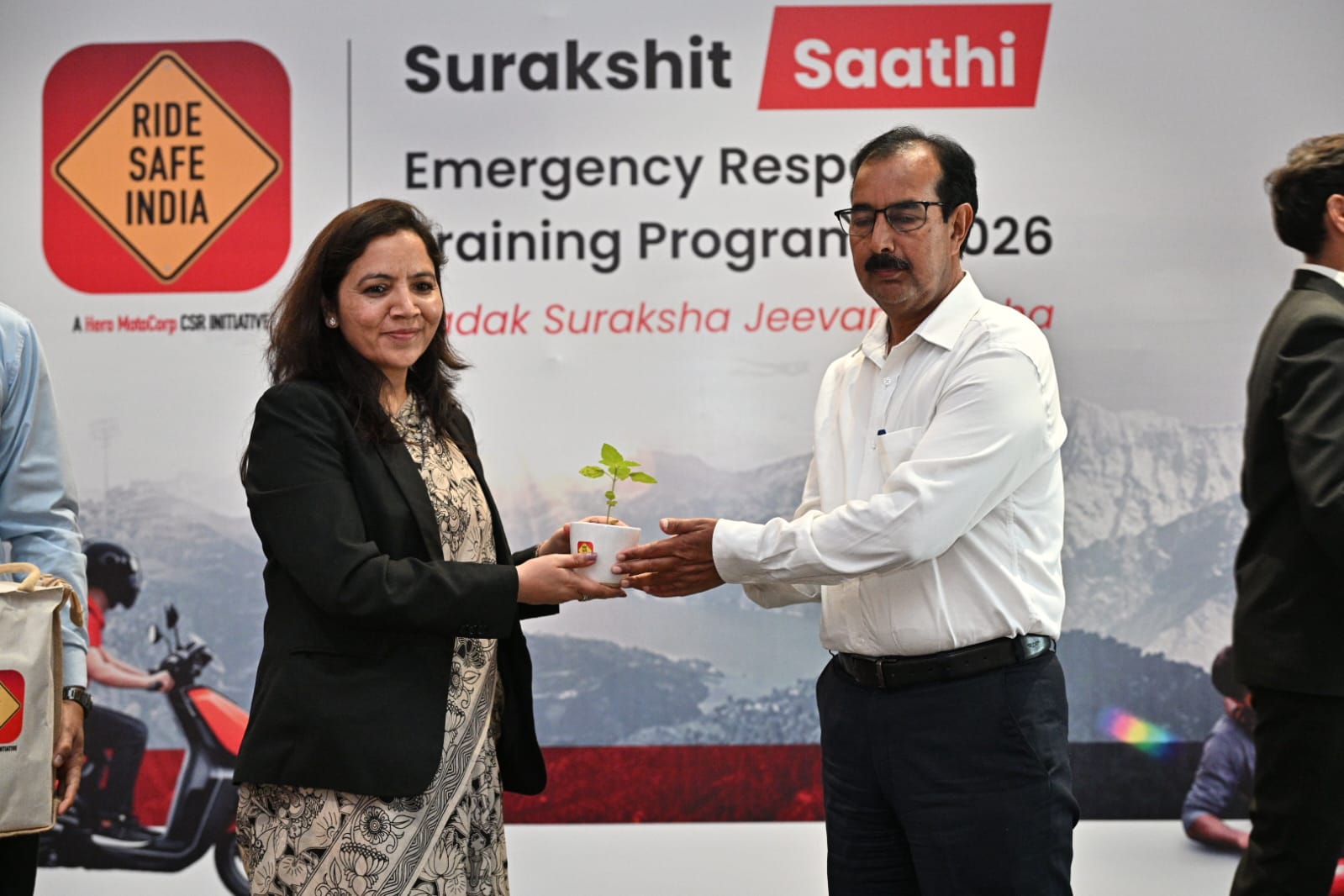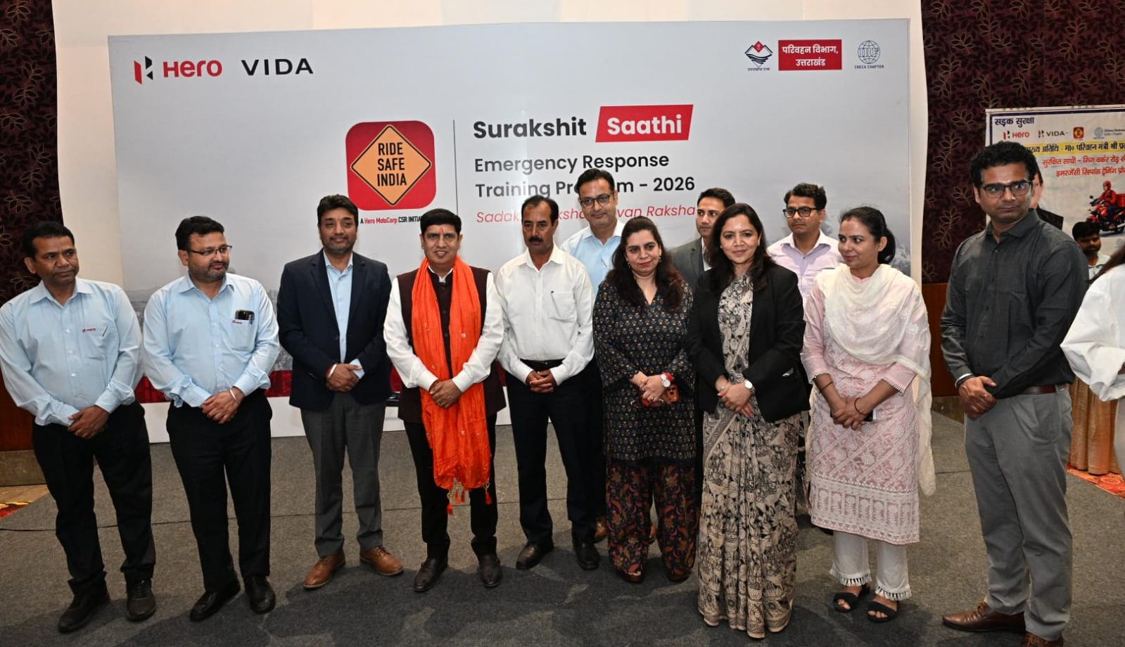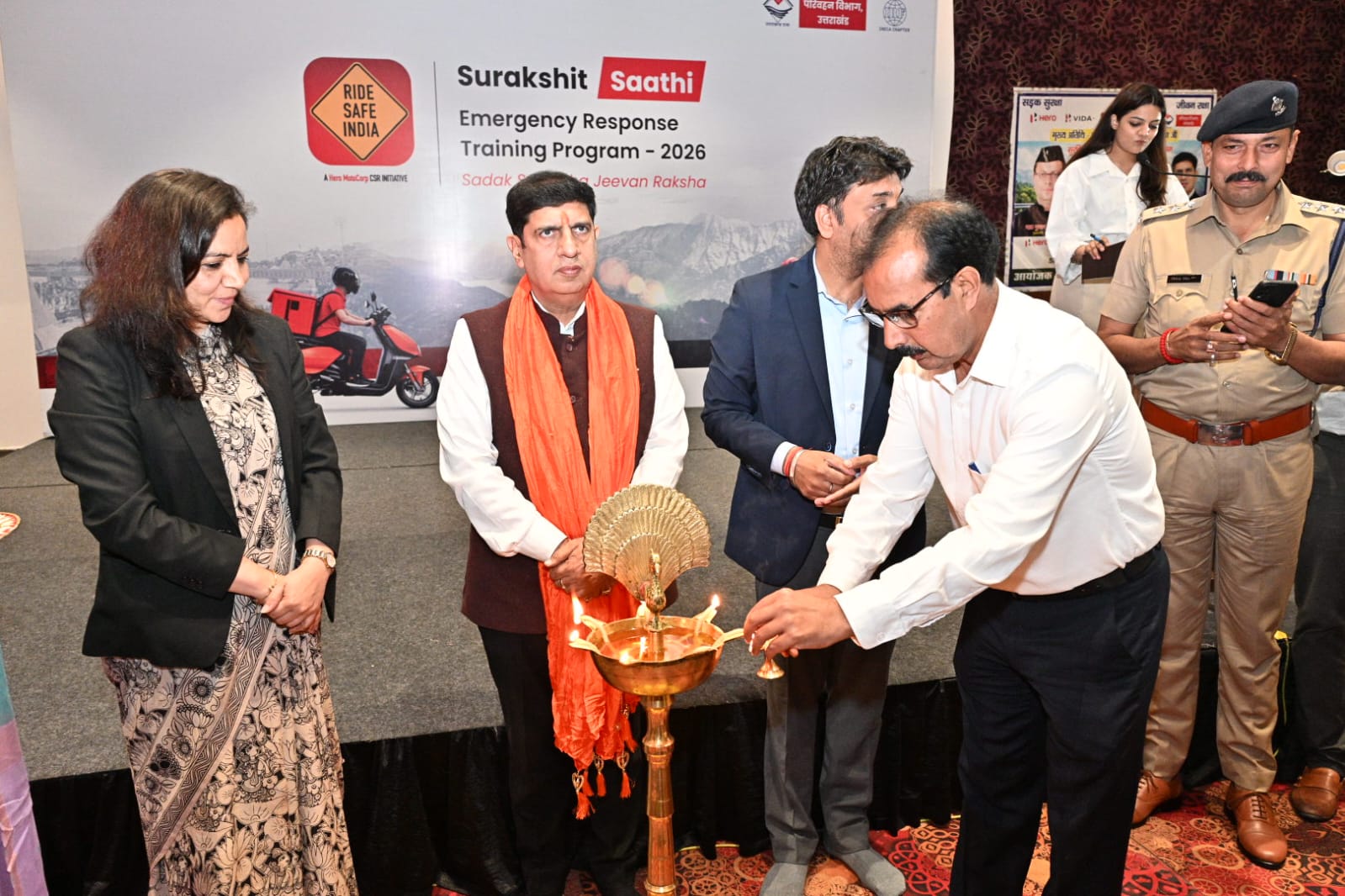 हरिद्वार। परिवहन विभाग, उत्तराखण्ड द्वारा Hero MotoCorp के CSR कार्यक्रम Ride Safe India के अंतर्गत, उप क्षेत्रीय परिवहन कार्यालय (ARTO), हरिद्वार के सहयोग से “सुरक्षित साथी – रोड सेफ्टी एवं इमरजेंसी रिस्पॉन्स प्रशिक्षण कार्यक्रम” का सफल आयोजन आज हरिद्वार स्थित एक स्थानीय होटल में किया गया।जिसका शुभारंभ मुख्य अतिथि परिवहन मंत्री प्रदीप बत्रा ने दीप प्रज्वलित कर किया।कार्यक्रम में विशिष्ट अतिथि अपर जिलाधिकारी पी आर चौहान, संभागीय परिवहन अधिकारी डॉ अनीता चमोला, संभागीय परिवहन अधिकारी संदीप सैनी, सीओ ट्रैफिक बिपेंदर सिंह,प्लांट एच आर हेड पंकज भट्ट, प्लांट हेड सुनील कुमार मौजूद रहे।