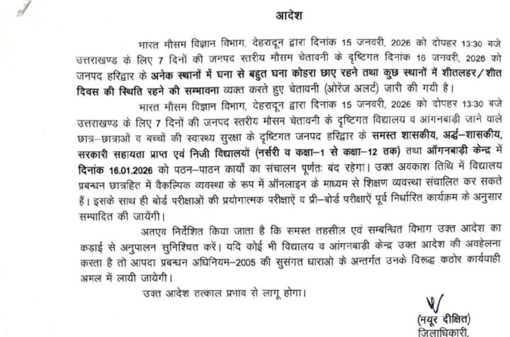 आदेश भारत मौसम विज्ञान विभाग, देहरादून द्वारा दिनांक 15 जनवरी, 2026 को दोपहर 13:30 बजे उत्तराखण्ड के लिए 7 दिनों...