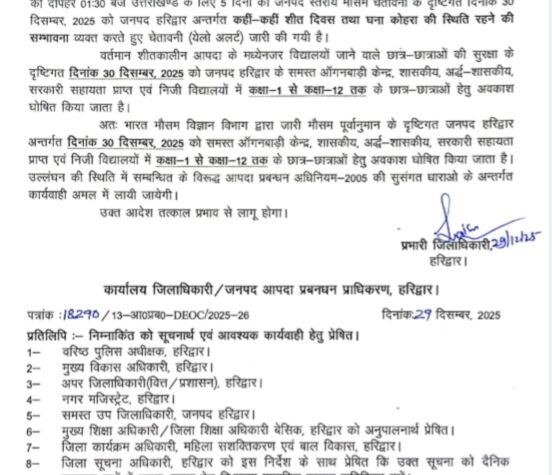 शीतलहर के दृष्टिगत नर्सरी से कक्षा 12 टक तक समस्त विद्यालय कल बंद रहेंगे !